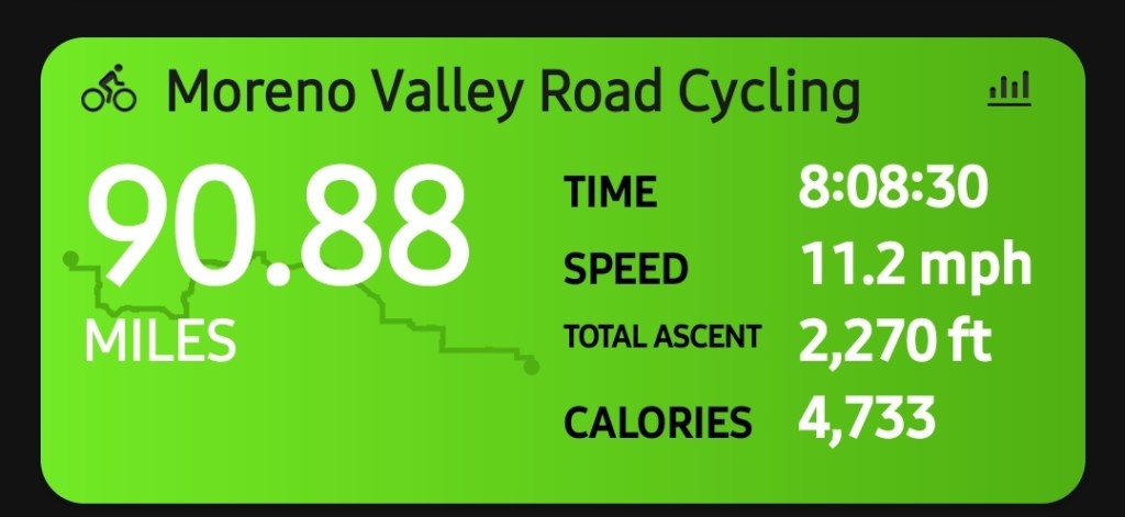 Another good day in the saddle. The day began with a nice ride through Riverside, CA, and then a short climb to get into a more agricultural area of the town. A quick SAG stop, and then the real fun began: a climb of about 7% grade for approx 5 miles left this old man huffin’ and puffin’ for much of the climb. I made it, although it was not the most graceful time on the bike. Additionally, we had freeway traffic rolling right next to us, just to add to the challenge.