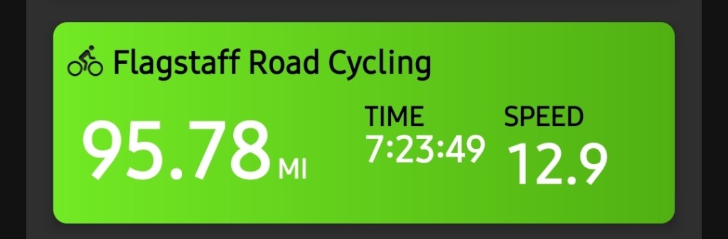 Today’s ride from Flagstaff, AZ, to Holbrook, AZ, was a slight decline most of the way. Additionally, we had a strong tailwind that pushed us all day long. So it was fast. For example, on Saturday, we rode 47 miles, most of which was climbing 5,000+. It took us 6-ish hours. Today, the first SAG was at 40 miles, and we arrived there in about 2 hours. What a difference the terrain makes.