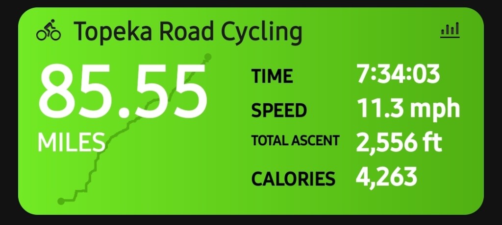 Today’s ride began in the cool air of Topeka, Kansas, with the 7:30 group (ie. later group). Unlike the first week of the tour, lately I have been starting with the 7 a.m. riders, because I would get my normal one to two flats per day, and with the delay in changing the innertube, I needed the additional time to stay in the mass of riders. But since we were no longer riding along the shoulder of the freeways, the entire group had been experiencing fewer flat tires. So off I went, confident that – along with everyone else – my flat tire days were (mostly) behind me.