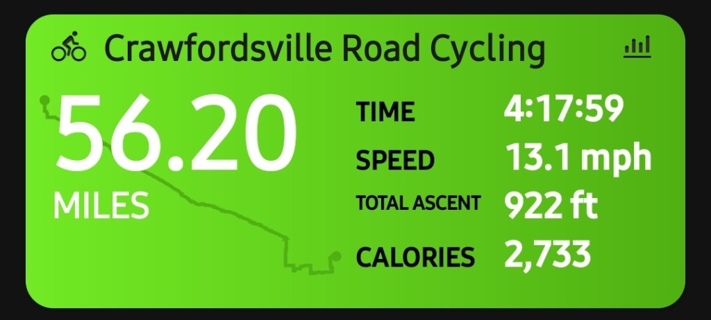 Tomorrow we leave Indianapolis and pedal 72 miles to Richmond, Indiana, which is just short of the border with Ohio. Our next five days are long ones – the shortest of which is just over 90 miles, and the longest trek 106 miles.