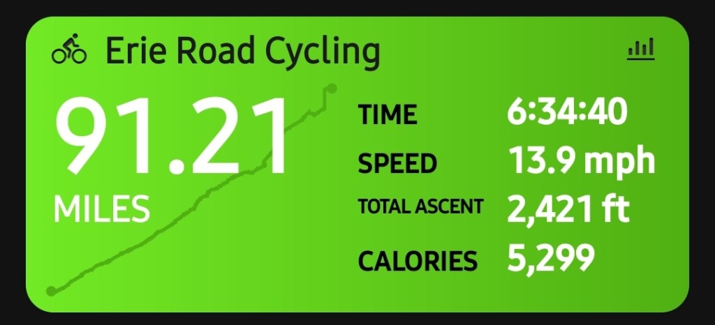 Day 42 – Erie, PA, to Buffalo, NY, 92.6 miles, 2,681 elevation gain. Having a rest day yesterday, we assembled this morning outside the hotel with a refreshed sense of purpose – and refreshed legs. With Boston just a mere 7 days away, I think we’re all wanting to get this adventure wrapped up. Not that we’re wishing it away – it has been a wonderful experience, have met wonderful people (both in the tour group and across the country), have viewed some awesome countryside, met some tough challenges and persevered, etc, etc…. but living out of two duffle bags and staying in a couple dozen hotel rooms kinda gets to a guy.